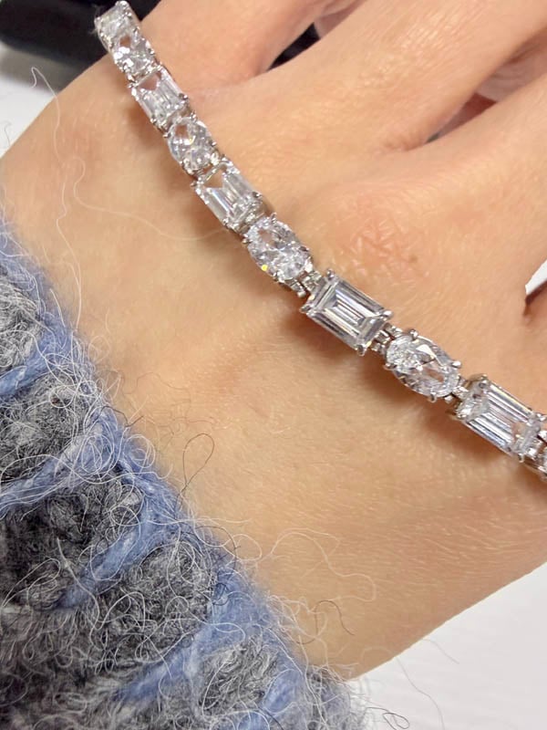 【Stone】Adorn her wrist in the lavish display of this tennis bracelet in sterling silver. This Alternating Oval & Emerald Tennis Bracelet is made of white, oval & emerald-cut sapphires with a stone size of 5*7 MM(Oval) & 5*7 MM(Emerald) respectively, and amounts to a total stone weight of 17.65 CT. TW. The bracelet is made of 925 sterling silver metal that has a total length of 6'', 7'', 8'', 9'', is silver and platinum-like in appearance, nickel-free, and has a total weight of 11.20 g. She'll enjoy the playful sophistication of this sweet bracelet in sterling silver.