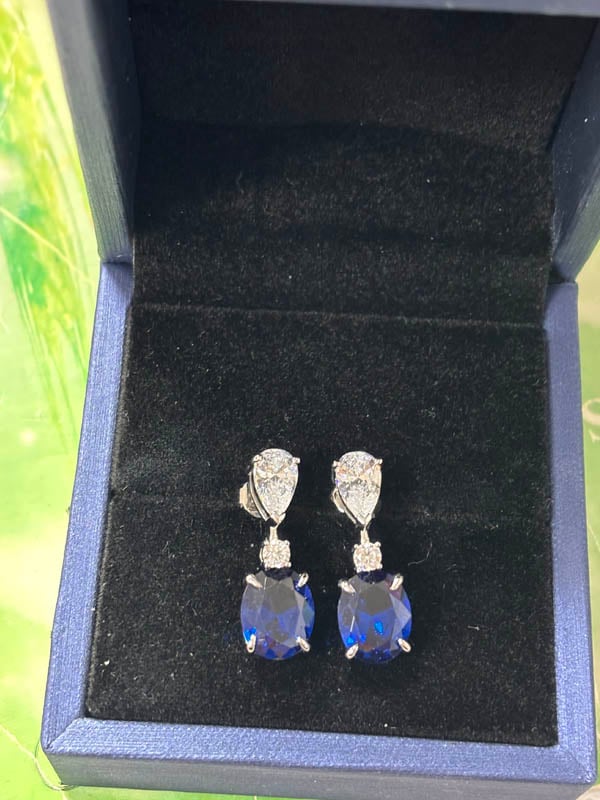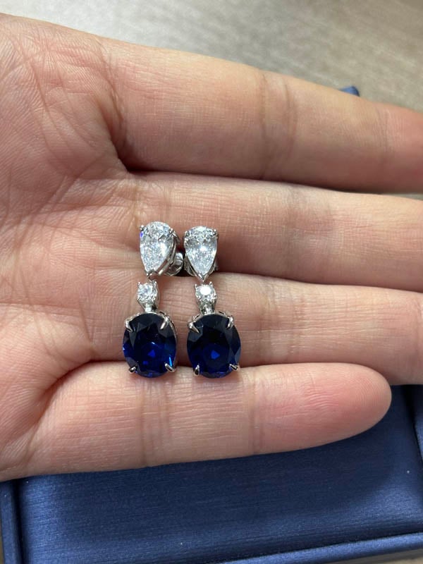【Design】Indulge in the elegance of our "Blue Sapphire Oval Cut Drop Earrings" for women, crafted in 925 Sterling Silver. With a total weight of 6.45 g and dimensions of 8.00 MM width and 22.80 MM height, these earrings feature a mesmerizing combination of oval, pear, and round-cut blue and white sapphire stones. Symbolizing loyalty and trust, these earrings represent the deep and enduring love between two hearts, where every moment is filled with serenity and bliss. Embrace the enchanting allure of these earrings and let them signify the eternal bond of love in your life.