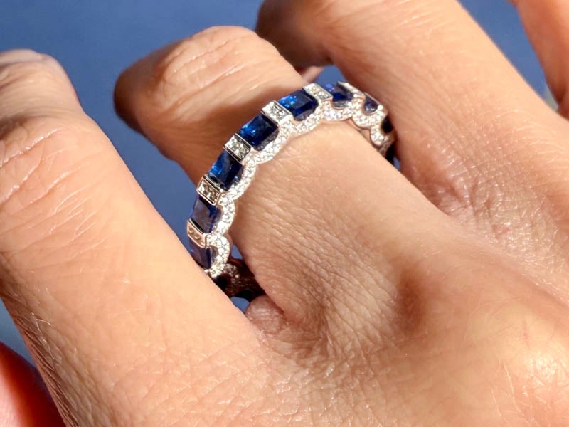 【Stone】A wedding band that looks vintage and came from a different era, the ring emphasizes the vibrant look of having blue sapphire gemstones, and both round and princess cut. It is made of 925 sterling silver,weighs 5.37 grams and has a stone weight of 6.50 carats. Even on the natural daylight, the wedding band's blue hues is hard to miss.
