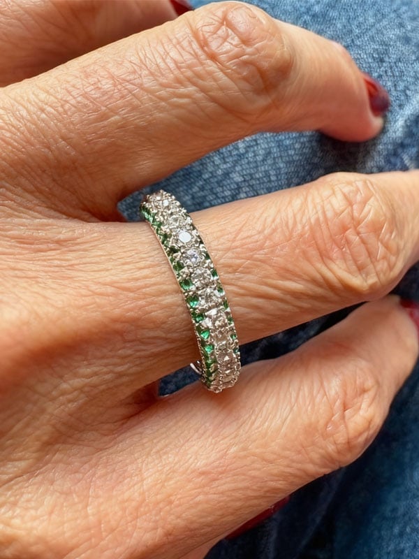 【Stone】The Italo Micro Pave Band Ring Eternity Wedding Band for Women is an exquisite piece of jewelry designed to add a touch of elegance to any special occasion. Crafted from 925 Sterling Silver, this ring features a unique micro pave setting that perfectly showcases the stunning round-cut white and green sapphires. The delicate yet sturdy design makes this ring an excellent choice for those who want a timeless and sophisticated wedding band that is both comfortable to wear and eye-catching. With a total weight of 3.22g and a carat total weight of 1.80 CT. TW., this ring is a must-have for any fashion-savvy bride looking to make a statement on her big day.