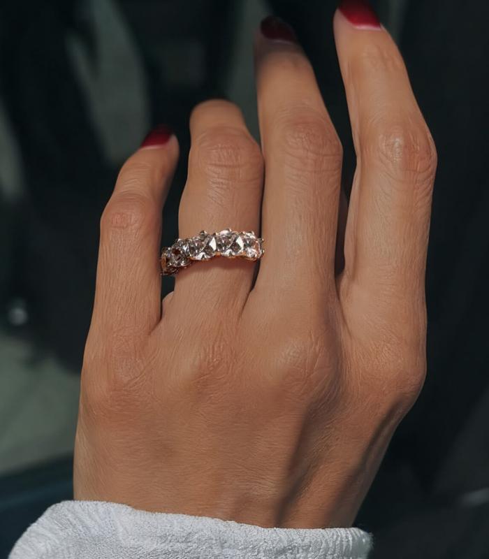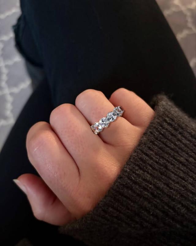 【Stone】This Five Stone Cushion Cut Wedding Band is made of 925 sterling silver metal that has a shiny platinum appearance, with a ring band width of 5.00 MM, a thickness of 3.85 MM and a total weight of 4.35 g. It also sports 5*5 MM sized white cushion-cut sapphire gems that has a total carat weight of 3.85 CT. TW. and a prong stone setting. this wedding band is brilliant symbol of your everlasting love.