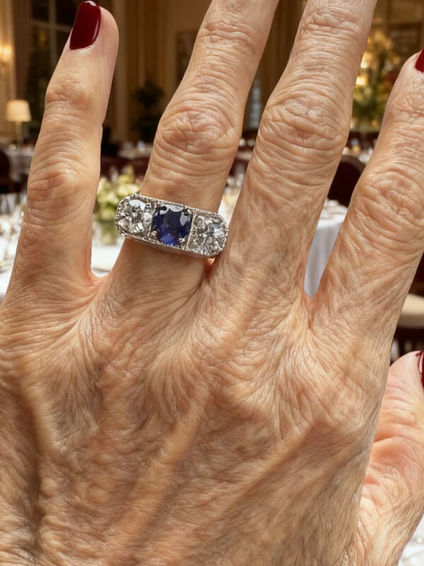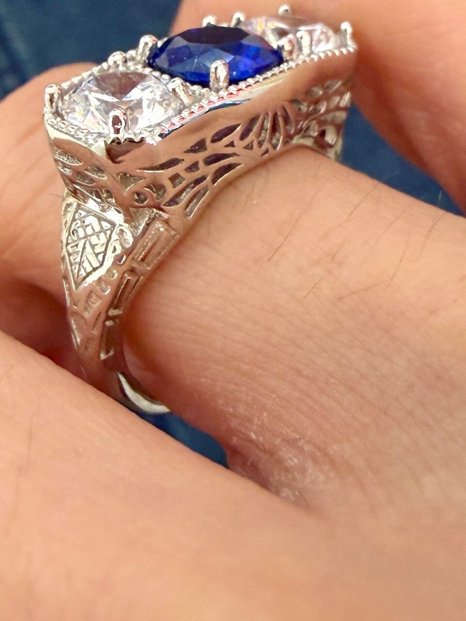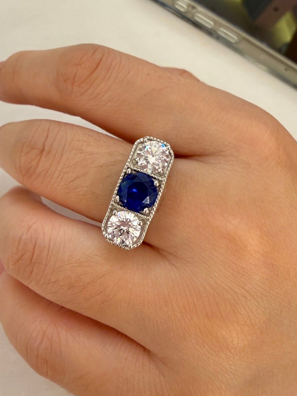Italo 3 Stone Antique Blue & White Sapphire Filigree Unique Engagement Rings