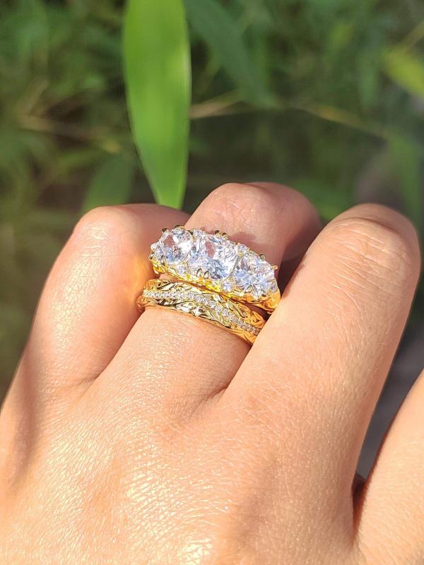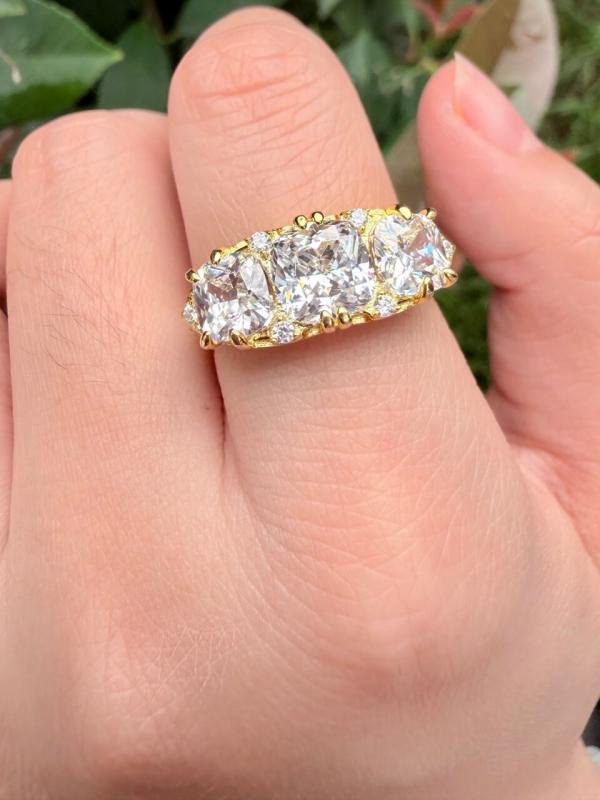 【Design】 Experience the brilliance of Italo Jewelry's Cushion Cut Half Eternity Band, crafted from premium 18K gold-plated sterling silver with rhodium plating for lasting radiance. This stunning ring showcases three magnificent cushion-cut white sapphires (4.58 CT total weight) accented by round-cut stones in secure prong settings, making this Cushion Cut Half Eternity Band a perfect balance of vintage charm and contemporary elegance with its substantial 8mm width!