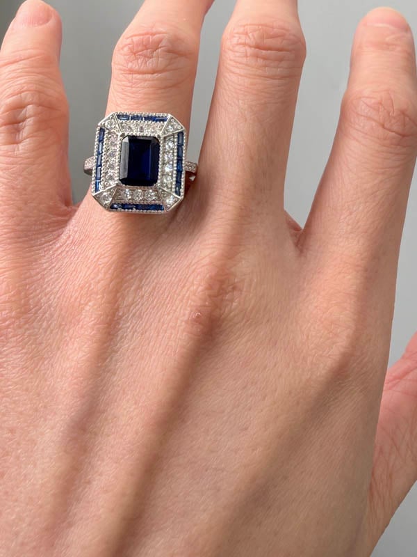 Italo Art Deco Emerald Cut Blue Sapphire Vintage Engagement Ring