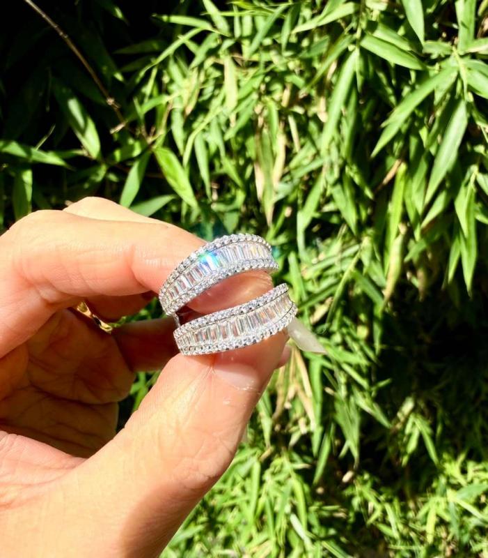 The Italo Baguette Cut Enhancer Wedding Band Sterling Silver Rings redefine elegance with their sophisticated design. This Enhancer Wedding Band, measuring 18.00 MM in width, features a dazzling array of white sapphires set in a combination of channel and prong settings. The intricate baguette, tap baguette, and round cuts ensure that the Enhancer Wedding Band catches the light beautifully, making it a standout accessory for any bride.