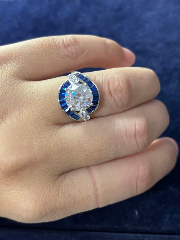 【Design】 Experience the grandeur of our Italo Ballerina Ring, masterfully crafted in 925 Sterling Silver with a total sapphire weight of 5.19 CT. This Ballerina Ring features a 3.87 CT round blue sapphire center embraced by a halo of white and blue sapphires, all shining with a platinum-like rhodium finish!
