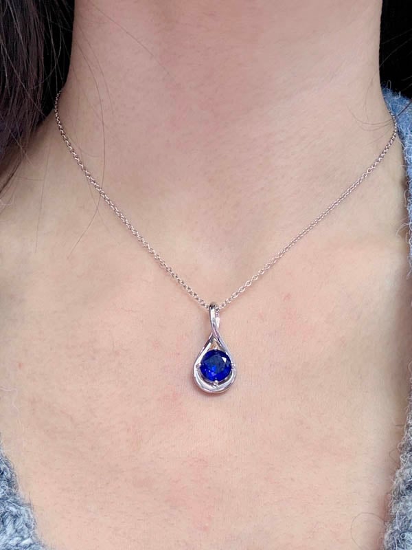 The Blue Sapphire Round Cut Drop Pendant Necklace For Women is a perfect blend of timeless elegance and modern design. The Round Cut Drop Pendant Necklace is crafted with precision, showcasing a stunning 2.00 CT. TW sapphire that beautifully complements any outfit. The pendant's size of 24.20*11.90 MM and thickness of 7.15 MM create a substantial yet elegant look.