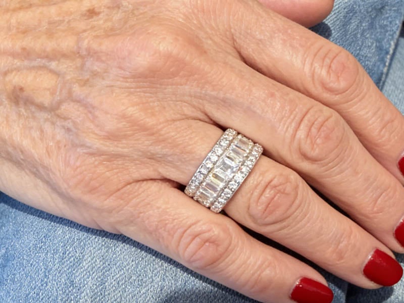 【Design】 The Emerald Cut Eternity Band from Italo Jewelry features stunning white sapphires set in a sleek 925 Sterling Silver channel setting. With a total weight of 8.76g and 6.34CT, this elegant piece radiates timeless beauty and sophistication.