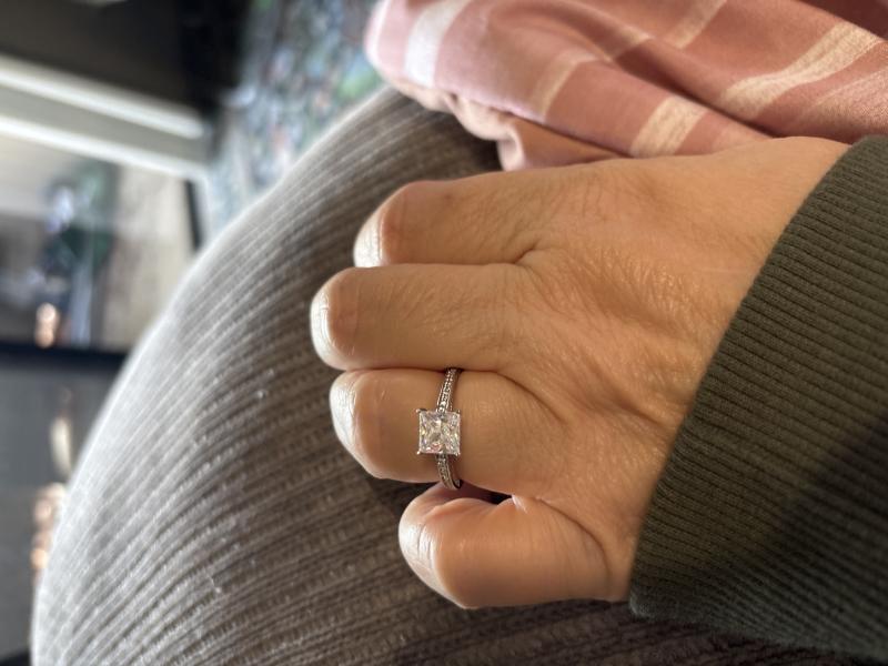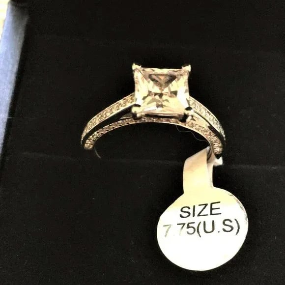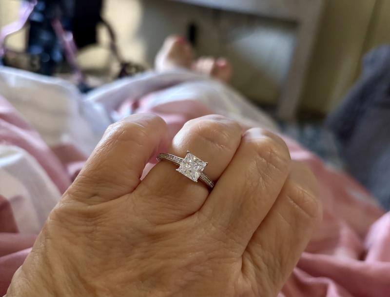 【Stone】The Classic Princess Cut Engagement Ring (2.32 CT. TW.) from Italo Jewelry is an elegant and timeless choice for any bride-to-be. The 2.00 CT. white sapphire at the center of the ring is set in a secure 4 prong setting and perfectly complemented by the sparkling round side stones. With a total weight of 4.6 g and a slim band width of 5 MM, this ring is comfortable to wear and has a subtle yet sophisticated look.