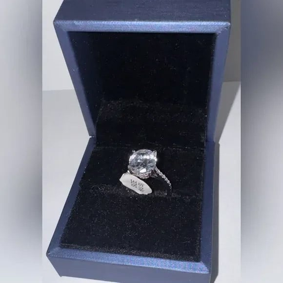 【Stone】The Italo Classic Oval Created White Sapphire Engagement Ring is a stunning piece of jewelry. The center stone is a large, white oval-cut sapphire with a 4 prong setting and a center stone weight of 5.00 CT. The ring is also embellished with many small, white round-cut sapphires on the sides. The ring is made of 925 sterling silver metal with a total weight of 4.5 g.