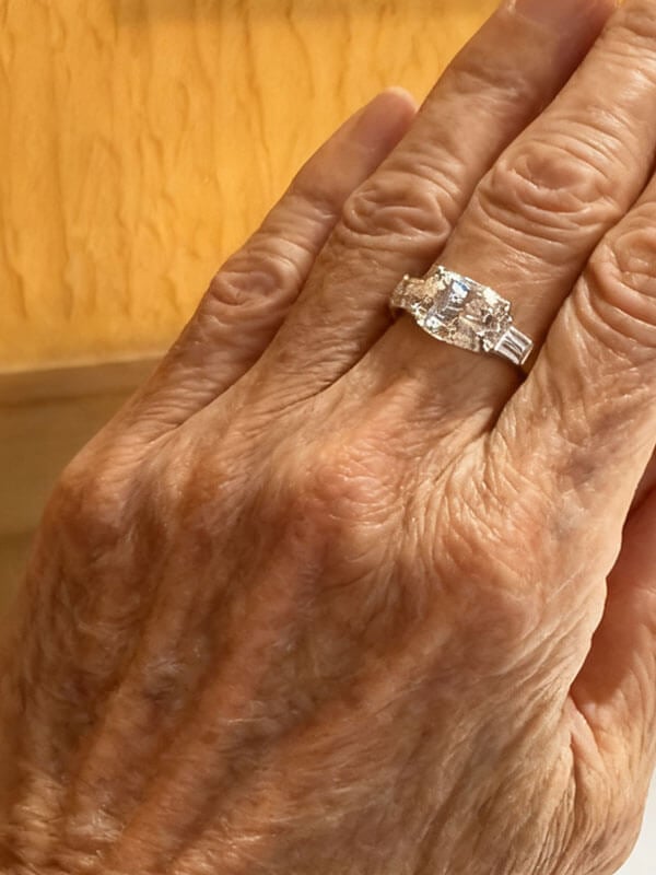【Design】 Italo's Cushion Cut White Sapphire Engagement Rings showcase a dazzling 2.50 CT cushion-cut center stone (7x9mm) flanked by baguette side stones totaling 2.86 CT. These exquisite Cushion Cut White Sapphire Engagement Rings feature a 7mm wide band with prong and bar settings in rhodium-plated sterling silver for maximum brilliance.