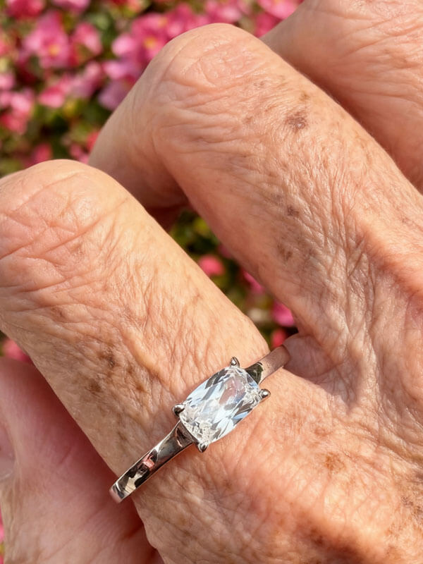 【Design】 Italo's White Sapphire Engagement Rings showcase a 0.50 CT cushion-cut white sapphire (4x6mm) set horizontally in sleek 925 sterling silver. The White Sapphire Engagement Rings feature a contemporary east-west orientation with rhodium plating for brilliant shine.