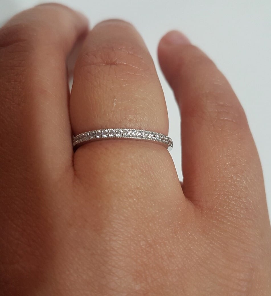 The Eternity Channel Setting Wedding Band from ItaloJewelry embodies everlasting love and unwavering commitment. This exquisite piece, crafted in 925 sterling silver, showcases a continuous circle of round white sapphires, each meticulously set within a channel enhanced by delicate milgrain detailing. The Channel Setting Wedding Band symbolizes the unbreakable bond shared by couples, its timeless design and precision in setting each gem reflecting the perpetual nature of love. It stands as an ideal emblem of an enduring promise, making the Channel Setting Wedding Band a quintessential representation of infinite love.