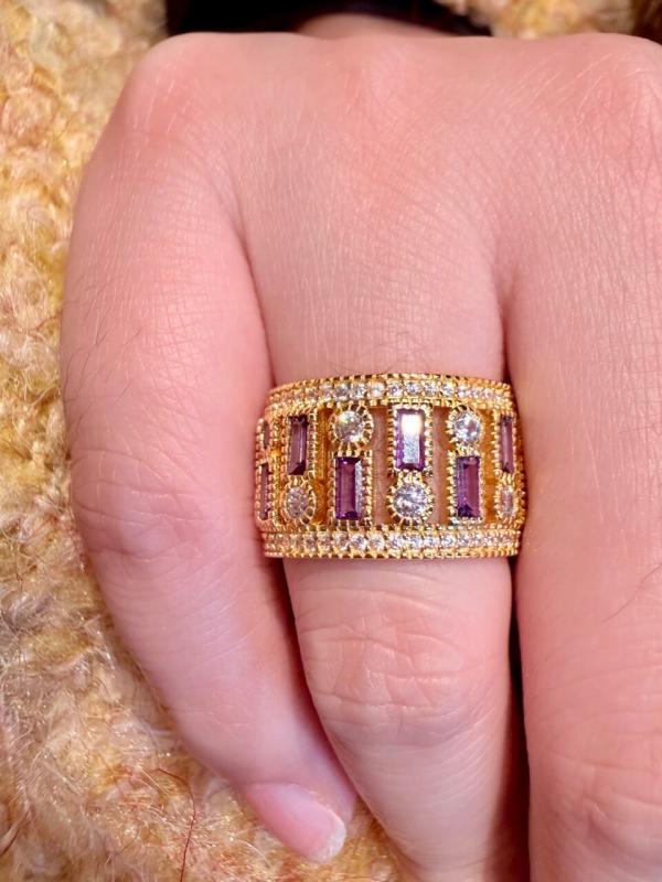Nothing says "forever" like the Italo Golden Baguette Cut Amethyst Vintage Wedding Band. Designed with 18K gold-plated sterling silver, this exquisite ring combines vintage charm and modern sophistication. Its 3.42 CT total weight and baguette-cut Amethyst stones reflect a love that shines brighter with time. With its rich purple hue and delicate milgrain bezel setting, this band is a testament to a timeless romance.
