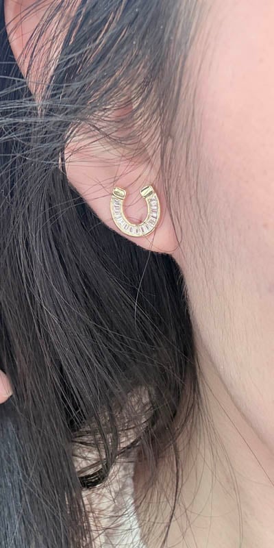 【Design】 Shine bright with ItaloJewelry’s Horseshoe Stud Earrings, crafted in 18K gold-plated sterling silver and set with 1.20 CT. TW white baguette-cut sapphires. Measuring 12.70mm in height, these Horseshoe Stud Earrings combine elegance with a touch of fortune!