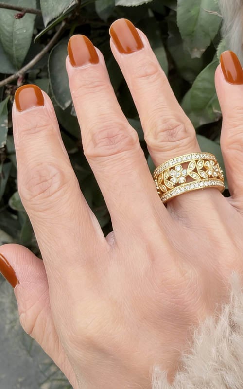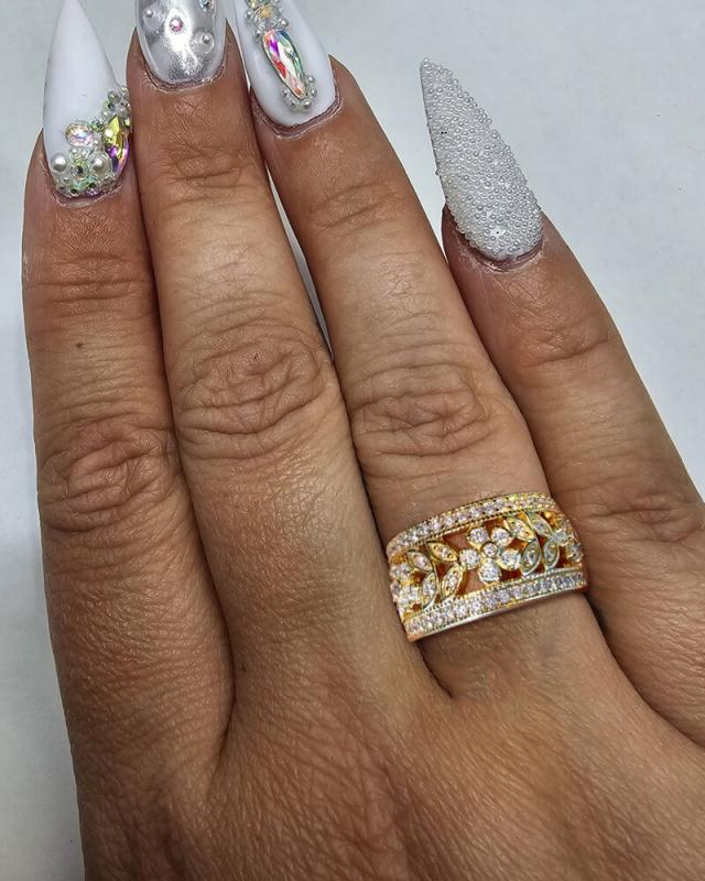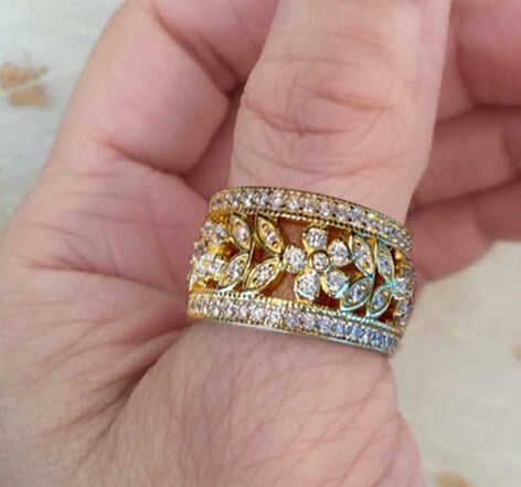 The Golden Floral Eternity Band stands out with its 11.50 mm width and stunning 2.14 CT. TW white sapphires, beautifully set in bezel and prong settings. Designed to mimic platinum’s luxurious finish with rhodium plating, it exudes sophistication while being nickel-free for everyday comfort. This is more than a ring—it's a promise of love that lasts forever.