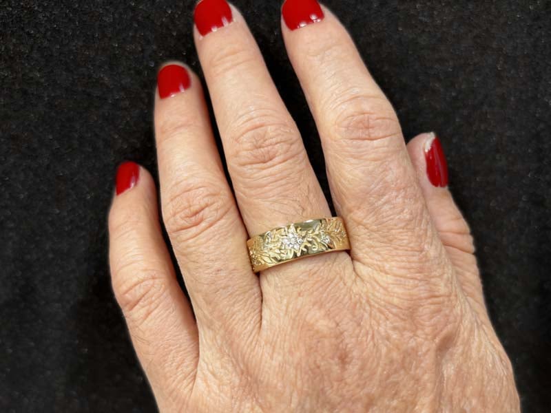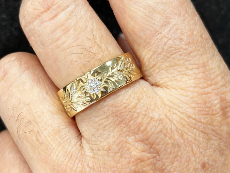 【Design】Admire the exquisite golden floral craftsmanship of our 7.43g Filigree Half Eternity Wedding Band, featuring delicate 0.15-carat white sapphires that make this Filigree Half Eternity Wedding Band a truly romantic masterpiece!