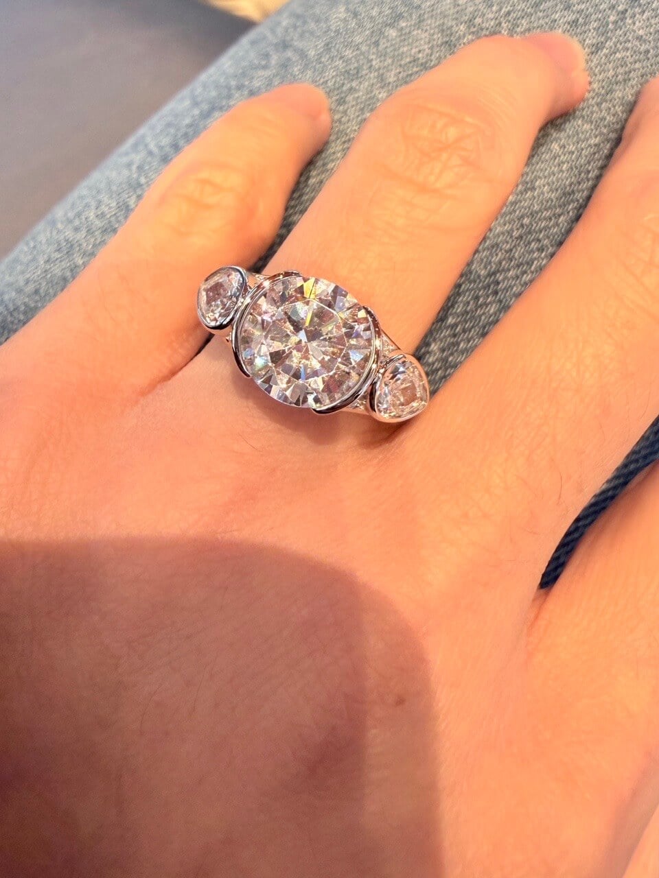 【Design】Admire the elegant half-bezel setting of these stunning Three Stone Engagement Rings For Women, crafted from 925 Sterling Silver and featuring 5.41 CT. TW of brilliant white sapphires—these exquisite Three Stone Engagement Rings For Women symbolize your past, present, and future together!