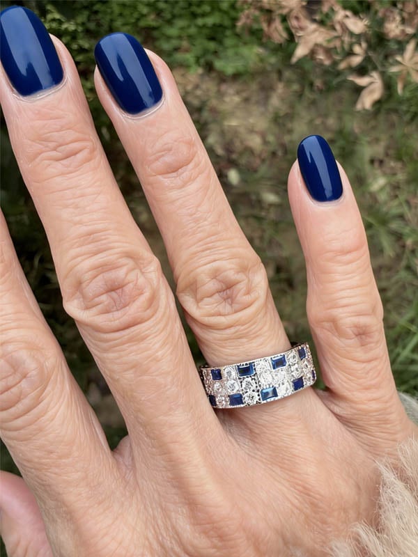 【Design】 Experience the vintage-inspired elegance of Italo Jewelry's Milgrain Bezel Ring, crafted from premium 925 Sterling Silver with rhodium plating for lasting brilliance. This stunning eternity band showcases alternating blue and white sapphires (3.84 CT total weight) in a combination of emerald and round cuts, all secured in our signature Milgrain Bezel Ring setting that adds antique charm to modern design!