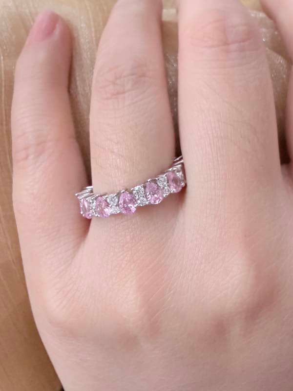 【Design】Embrace the continuous pear-cut elegance of this stunning Pink Stone Eternity Wedding Band, masterfully crafted from 925 Sterling Silver and showcasing 2.36 CT. TW of delicate pink and white sapphires—this extraordinary Pink Stone Eternity Wedding Band redefines eternal romance!