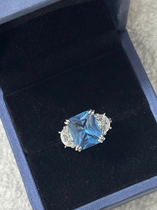 Each Blue Topaz Wedding Ring For Women is crafted with exceptional attention to detail. The radiant cut blue topaz is secured by a double prong setting, surrounded by delicate white side stones that accentuate the center stone's brilliance. With half-moon and round side stones, this Blue Topaz Wedding Ring For Women combines modern sophistication with timeless beauty, creating a masterpiece that speaks to the heart.