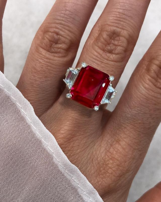 【Design】Behold Italo Jewelry's Ruby Emerald Cut Unique Three Stone Engagement Ring, a masterpiece crafted in 925 Sterling Silver, weighing a solid 5.80g. The dazzling 6.00 CT. ruby red sapphire, set in prong, is flanked by pristine white trapezoid and round-cut side stones, symbolizing the past, present, and future of a love story. This ring isn't just a piece of jewelry; it's a heartfelt promise of a love that grows and shines brighter with time. Secure this emblem of eternal love today.