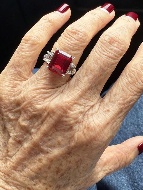 Italo Ruby Emerald Cut Unique Three Stone Engagement Ring