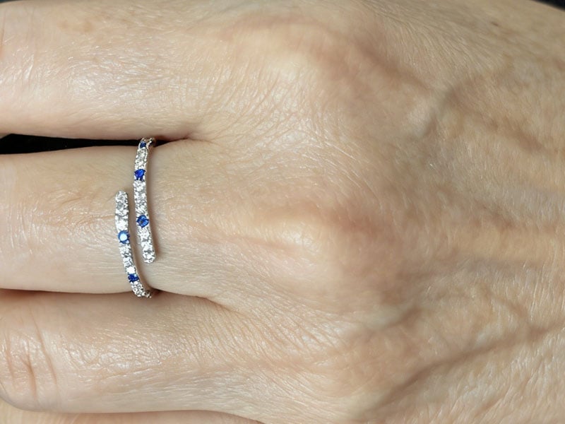 【Design】 Italo's Spiral Design Wedding Band showcases 0.33 CT round-cut blue & white sapphires (1.5mm) in a mesmerizing spiral pattern. The Spiral Design Wedding Band features a sleek 5mm width with rhodium plating for lasting brilliance.