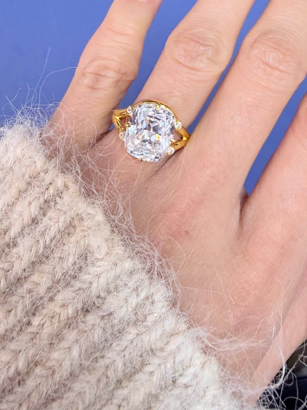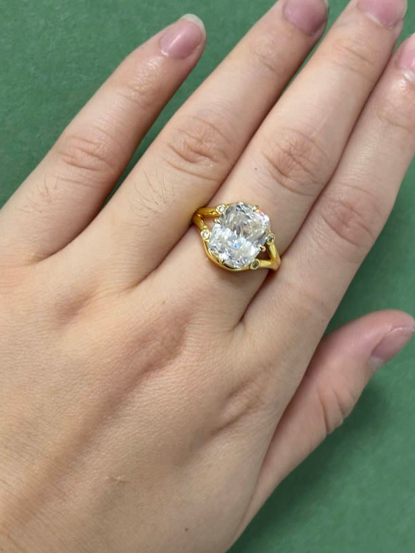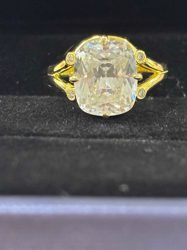 【Design】Discover our elegant Split Shank design featuring this magnificent Cushion Cut Engagement Ring, this stunning Cushion Cut Engagement Ring showcases a 5.50 CT center stone in 18K Gold Plated Sterling Silver weighing 6.71g!