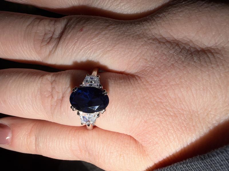 【Stone】Promise to love her for a lifetime when you present her with this elegant Three Stone design engagement ring.This is a elegant Ring! its center stone is one big Blue Oval cut sapphire gem with Double Prong Stone Setting,which has a total center stone weight of 4.00 CT. Its side gems are two small White Half-Moon cut sapphires with a Prong stone setting.The ring is made of 925 Sterling Silver metal with a total weight of 4.55 g.