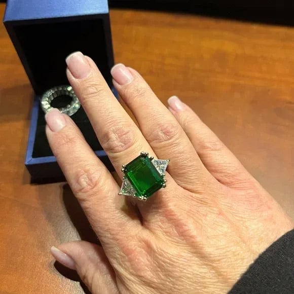 【Stone】You'll both treasure the moment when you offer her this shimmering Engagement Ring Set.This Emerald Cut Engagement Ring Set is made of 925 sterling silver metal with a total weight of 13.2g that is nickel-free with a platinum appearance. The ring's gems is made of green emerald-cut sapphire with 8 prong stone setting, while its side gems are white, round & trillion-cut sapphire gems with a prong stone setting. Its total center stone weight is 5.00CT. & 0.75CT.*2, and its total carat stone weight is 15.00CT.