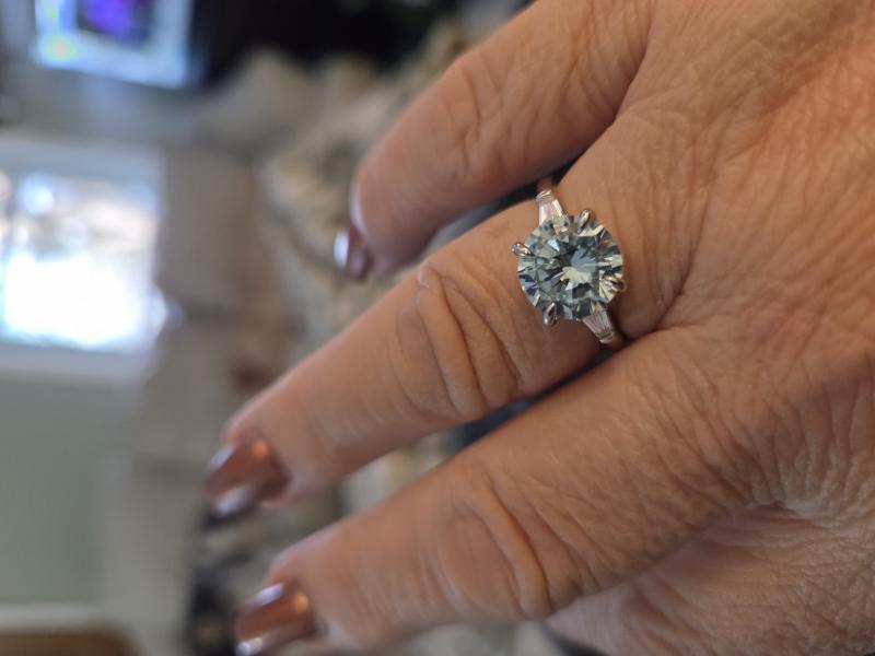 【Stone】This Three Stone Created Aquamarine Engagement Ring from italojewelry features a beautiful round cut Aquamarine Blue Sapphire center stone with a weight of 3.85 CT, set in 925 Sterling Silver with a 4 prong setting. The side stones are Baguette cut White Sapphire, which are set with a Tension Side Stone setting, creating a unique and modern design. With a total weight of 3.4g, this ring is a stunning and affordable option for those looking for an elegant engagement ring.