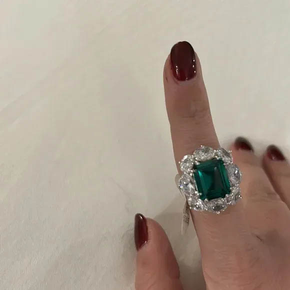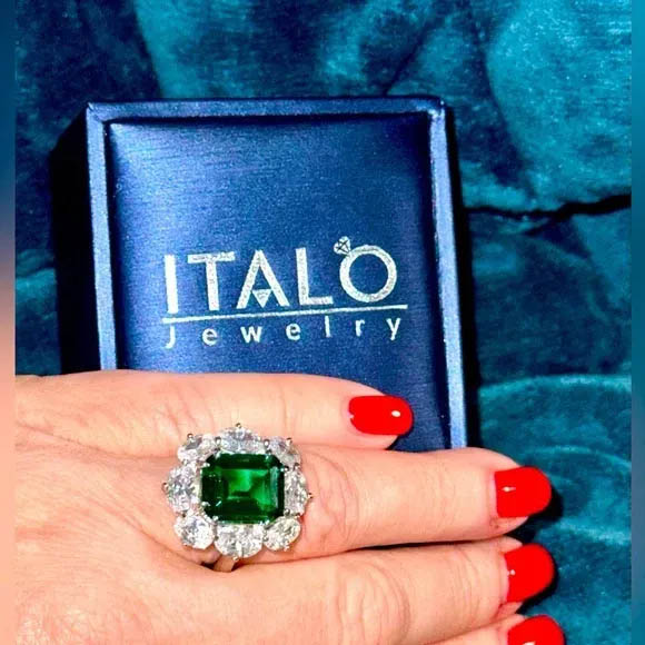 【Stone】The Italo Emerald Engagement Ring Halo Engagement Ring is an exquisite piece of jewelry that combines both beauty and affordability. Made of 925 sterling silver, this ring has a total weight of 11.35 g, making it both durable and comfortable to wear. The center of the ring is adorned with a dazzling 3.0CT green emerald, which has been expertly cut into an emerald shape. The emerald is set into place with four prongs, allowing the light to shimmer and dance off the stone in all directions. The sides of the ring are adorned with sparkling white round-cut stones, adding an extra touch of elegance to this already stunning ring. Overall, this affordable and stylish ring is the perfect symbol of love and commitment for any couple.