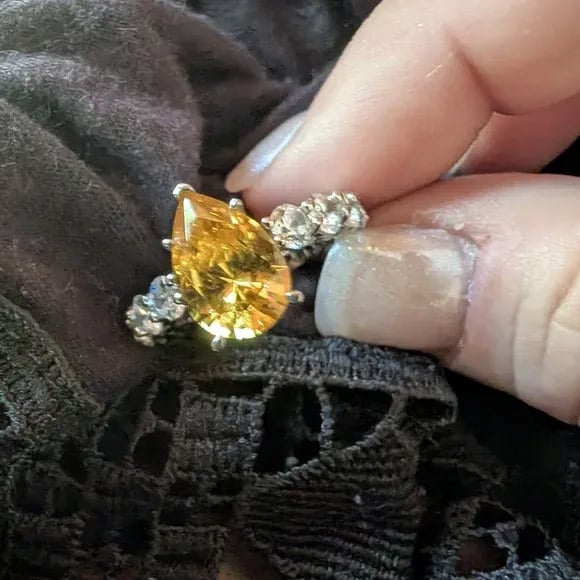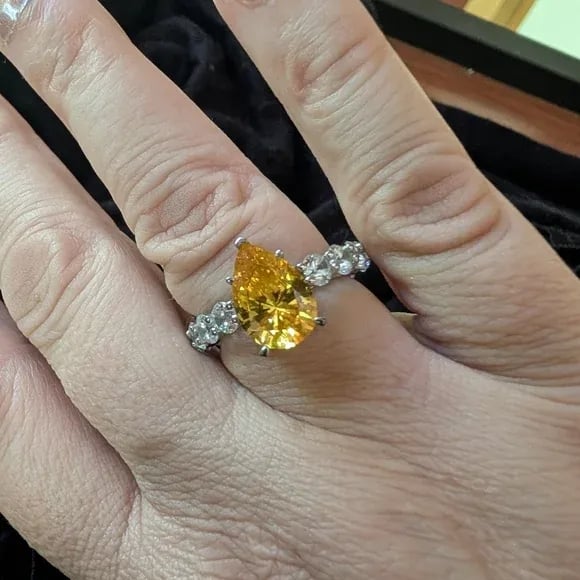 【Stone】Make a statement with Italojewelry's Yellow Topaz Pear Cut Unique Engagement Ring Promise Ring. Crafted from 925 Sterling Silver with a total weight of 10.15g, this ring features a dazzling 4.00 CT pear-cut Yellow Topaz center stone set in 5 prongs, accented with sparkling round White Sapphire side stones. This stunning ring is the perfect choice for anyone looking for a unique and eye-catching engagement or promise ring.